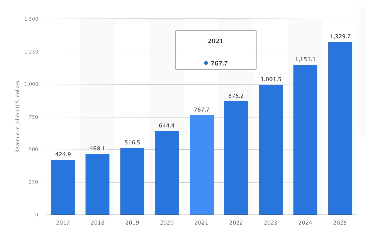 - Between 2022 and 2025, we’re expecting to see the ecommerce market grow to $1.3 trillion.